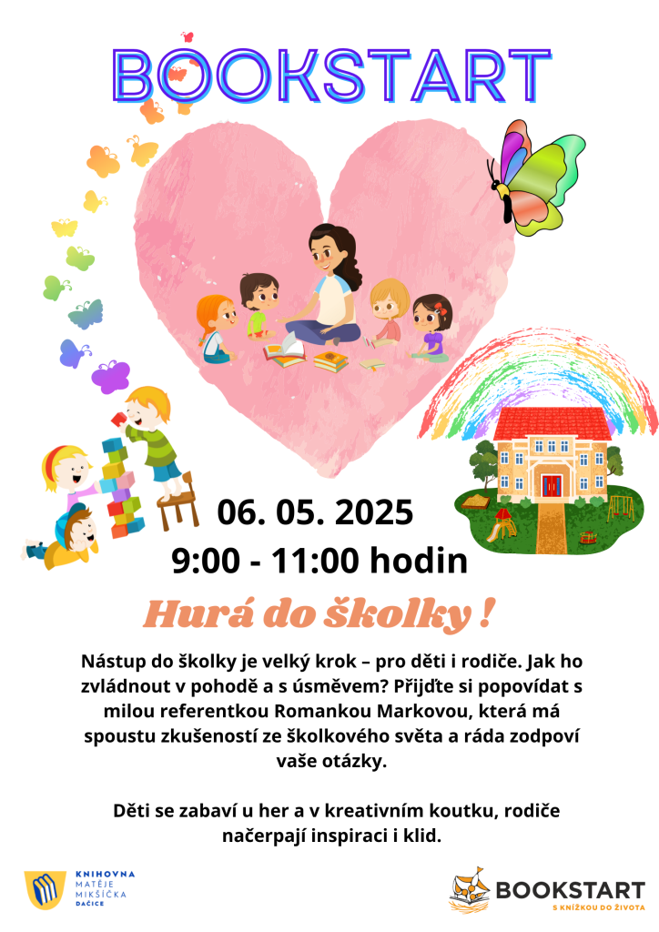 Nástup do školky je velký krok pro děti i rodiče – často plný očekávání, ale někdy i obav a nejistoty. Právě proto je důležité být na tuto změnu dobře připravený a pomoci dětem cítit se bezpečně a v klidu. Své dlouholeté zkušenosti ze školkového prostředí s námi přijde sdílet Romanka Marková. Poví nám o tom, jak může vypadat přirozený a klidný přechod do školky, představí dačické školky a ráda zodpoví Vaše otázky. Děti si mezitím mohou zahrát školkové hry a zabavit se v kreativním koutku.