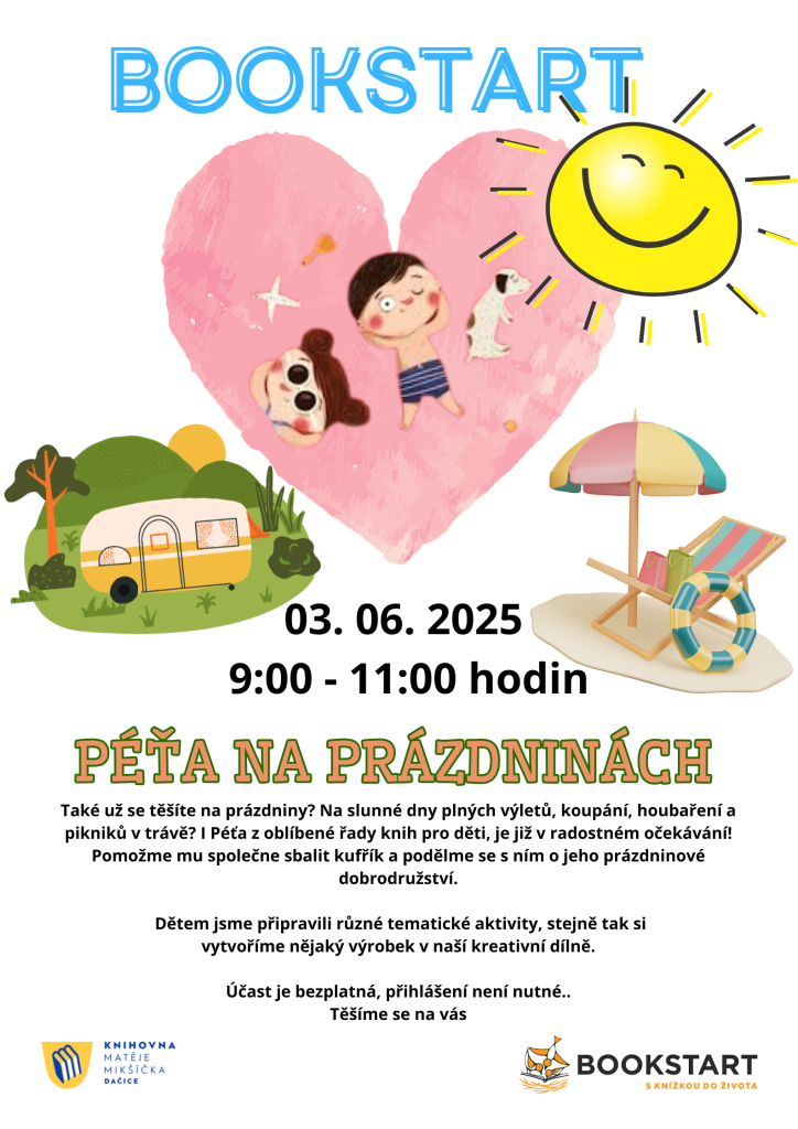 V úterý 3. 6. 2025 od 9 hodin se budeme těšit s oblíbeným knižním hrdinou Péťou na prázdniny. Společně pomůžeme Péťovi sbalit kufřík a povíme si, co všechno můžeme v létě prožít. Vyzkoušíme si jízdu autobusem, zaplaveme si a oddychneme si na pikniku v trávě. Vedle pohybových aktivit na děti jako vždy čeká malá kreativní dílnička. Tento Bookstart bude již posledním v náhradních prostorech. Další Bookstart proběhne na podzim, již v naší nové knihovně, na kterou se všichni moc těšíme.