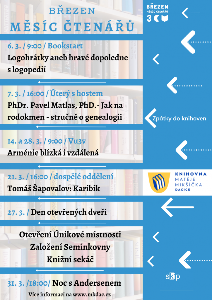 Na začátku měsíce přivítáme rodiče a malé čtenáře v rámci projektu Bookstart. Pozvání přijala paní logopedka, která rodičům ukáže, jakým způsobem začít s dětmi mluvit a číst. Těšit se můžete na spoustu hraní, kreslení a povídání. Pokračovat bude i Univerzita třetího věku. Naši studenti se tento semestr rozhodli prozkoumat dalekou Arménii a její krásy.