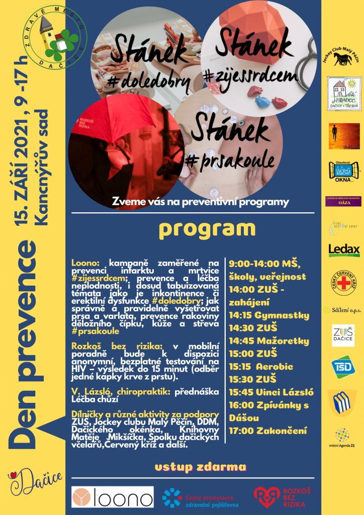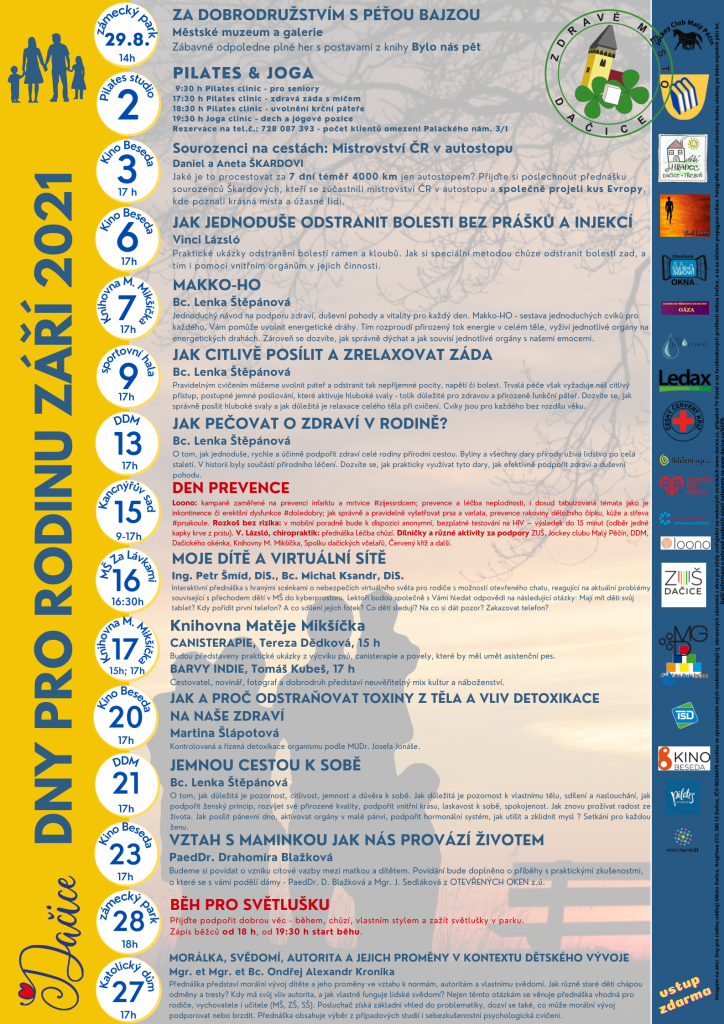 Velice bohatý program si na září přirpavilo Zdravé město Dačice a Místní agenda 21. Celé září je věnované témtu zdraví, což je téma nadmíru aktuální a jeho důležitost a význam zdůrazňuje stále neskončená pandemie covidu19. Udělejte si chvíli pro větší informovanost o svém zdraví a zapojte se. Na všechny programy je vstup volný.