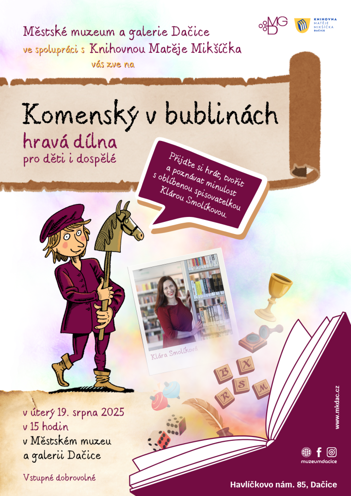 Vydejte se na dobrodružnou cestu do 17. století po stopách Jana Amose Komenského – hravou formou, s komiksem a fantazií! V rámci tvůrčí dílny Komenský v bublinách společně s autorkou nahlédneme do zákulisí vzniku knihy S Komenským do komiksu: Únikovka s Amosem a stejnojmenné výstavy.