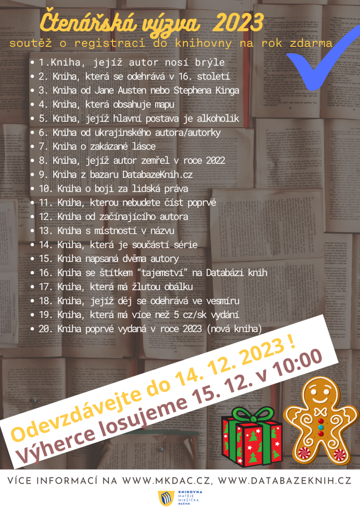 V pátek 15. prosince v 10:00 odměníme tři vylosované statečné čtenáře, kteří nám odevzdali svou splněnou čtenářskou výzvu pro rok 2023. Losování proběhne on-line na Facebooku knihovny. Hodně štěstí!