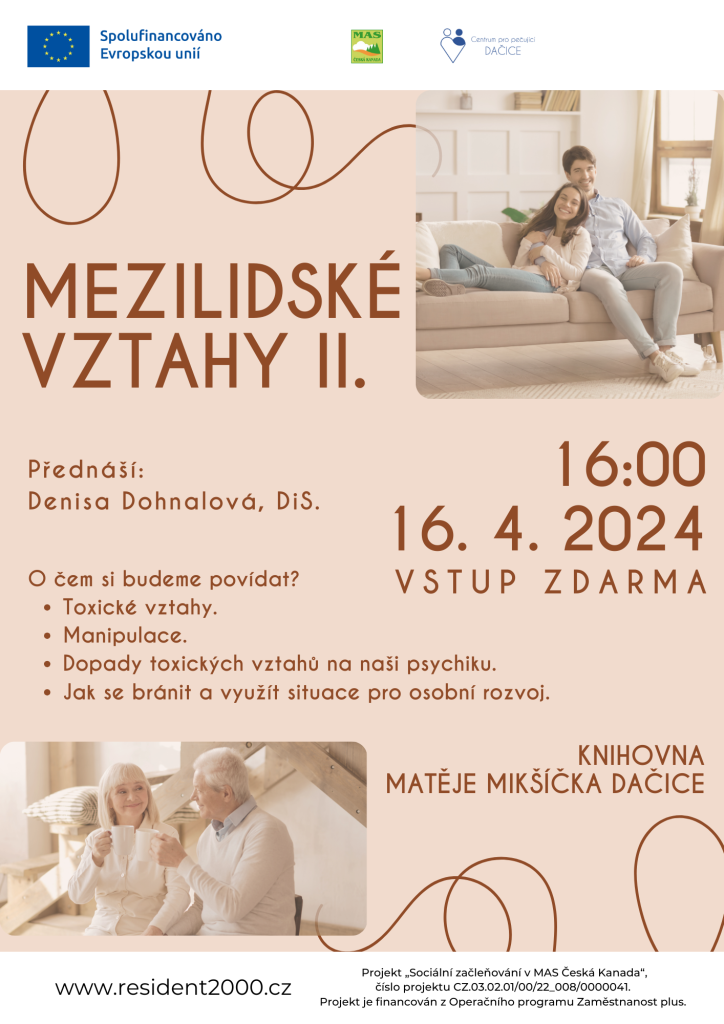 Akce ve spolupráci s O.p.s. Resident 2000 se koná v úterý, 16. 4. 2024. Přednáší terapeutka Denisa Dohnalová.
