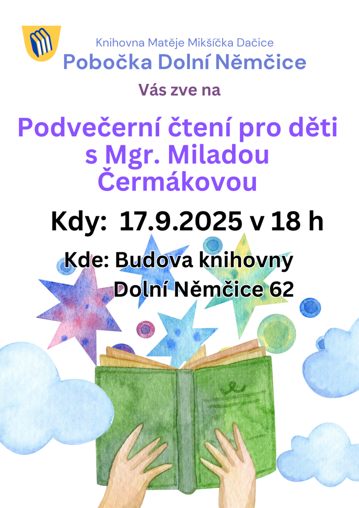 Srdečně Vás zveme naši pobočku v Dolních Němčicích! Přijďte si užít chvíli klidu, fantazie a společného čtení. Knihovna v podvečerním tichu ožije čtením pro děti díky Mgr. Miladě Čermákové.