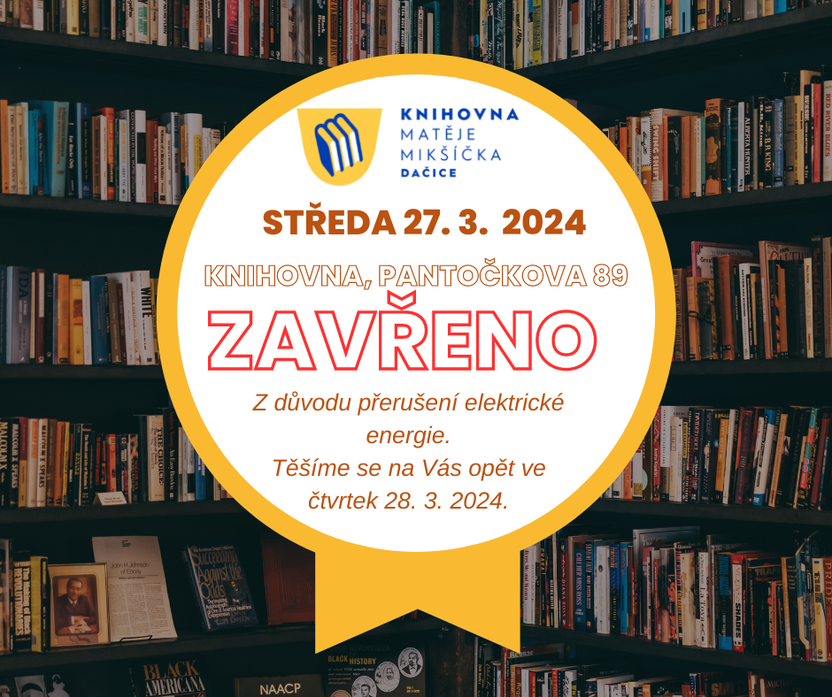 Upozorňujeme naše čtenáře, že ve středu 27. 3. 2024 bude knihovna z důvodu přerušení dodávky elektrické energie uzavřena. Těšíme se na Vás opět ve čtvrtek 28. 3. 2024. Děkujeme za pochopení.