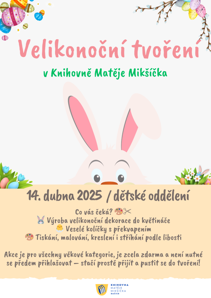 Přijďte si s námi užít veselé velikonoční tvoření! V pondělí 14. dubna 2025 bude v dětském oddělení knihovny otevřená velikonoční dílna, kde se fantazii meze nekladou.