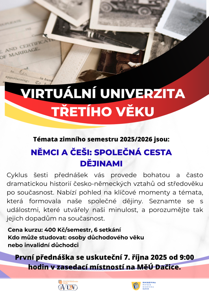 Městská knihovna Dačice zve seniory a invalidní důchodce na zimní semestr Virtuální univerzity třetího věku. Letošní cyklus šesti přednášek nese název „Němci a Češi: Společná cesta dějinami“ a nabídne poutavý pohled na naši minulost – od středověku až po současnost.
