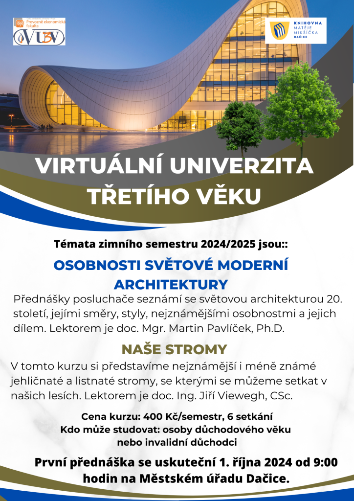 Startuje další semestr Virtuální univerzity třetího věku. VU3V přináší směs zajímavých informací o nejrůznějších tématech, které jsou zpracovány do krátkých video přednášek. Rozšíříte si obzory, zlepšíte sebevědomí, kvalitně vyplníte volný čas, a to vše v příjemné a přátelské atmosféře. Výuka probíhá mimořádně v zasedací místnosti na Městském úřadu Dačice jednou za čtrnáct dní. Přednáška je zpracována a natočena vysokoškolskými lektory Provozně ekonomické fakulty České zemědělské univerzity v Praze. Vyzkoušet si atmosféru univerzity třetího věku můžete na první přednášce 1. října 2024 od 9 hodin.