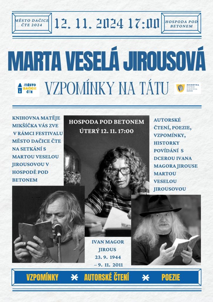 Paní Marta Veselá Jirousová bude vzpomínat na svého tátu Ivana Magora Jirouse v úterý 12. 11. 2024 v hospodě Pod Betonem od 17 hodin. Autorské čtení poezie, vzpomínky, historky. Vstupné dobrovolné.