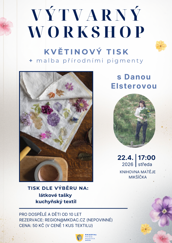 Po úspěšném výtvarném workshopu s akvarely vás srdečně zveme na pokračování tvořivého cyklu – tentokrát si společně vyzkoušíme novou techniku: květinový tisk na textil (ecoprint). Workshop se uskuteční ve středu 22. dubna 2026 od 17:00.